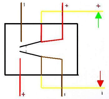 Zum Umpolen der Spannung werden beide mittlere Ausgänge gelb auf den Motor ange - schlossen. Plus rot und Minus schwarz über Kreuz auf die verbleibenden Stifte oben und unten. Am Relais links ist Plus unten, Minus oben. Nach dem Umschalten rechts Minus unten, Plus oben. Links Vorwärts-, rechts Rückwärtsfahrt oder umgekehrt, je nach Motorbelegung.