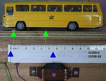 Grüner Pfeil vorn Lenkmagnet, hinten 2 Schaltpunkt Fahrzeugreedkontakt, Abstand dazwischen nur 45mm, Bus bleibt stehen, da Abstand vorderem Schaltpunkt des SRK in der Fahrbahn bis Mitte Stopp - spule 55mm (blauer Pfeil hinten) ist, daher 80mm Abstand zum SRK 2. Bei unseren selbstgebauten LKW ist der Abstand Magnet zum Schaltpunkt SRK hinten 35mm, die stoppen sich nicht selbst.